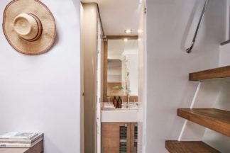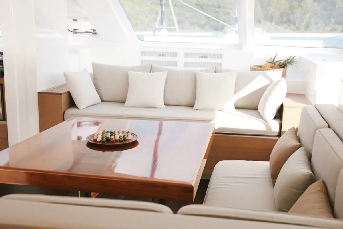 Inside the yacht, wide doors lead into the salon where there is a generous lounge area with built in formal dining, a bar with seating and open-plan galley. Polished woods are paired with contemporary fabrics and custom furnishings. Pelican’s wrap-around windows allow plenty of natural light in and highlight the scenic views as you sail past perfect beaches with palm-lined shores and those staple Seychelles granite formations.